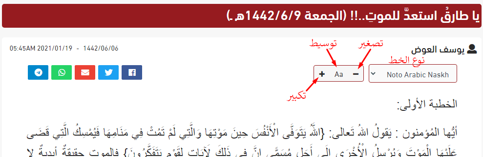 تم إلغاء خاصية اختيار الخطوط وحجمها وذلك لوجود خلل عند نشر الخطبة ..