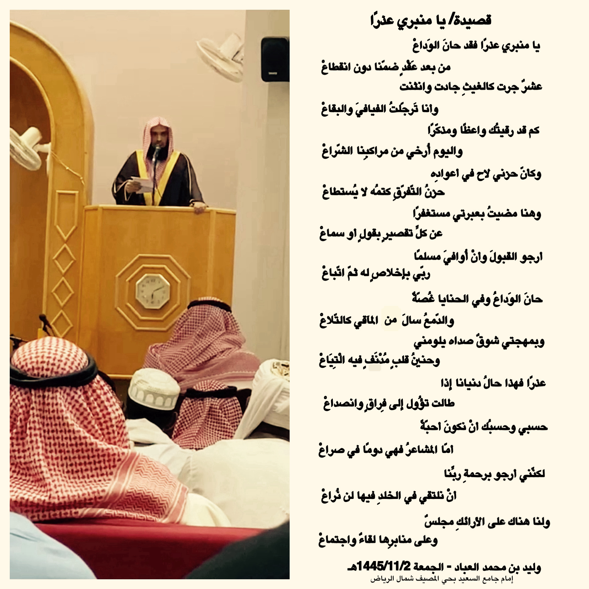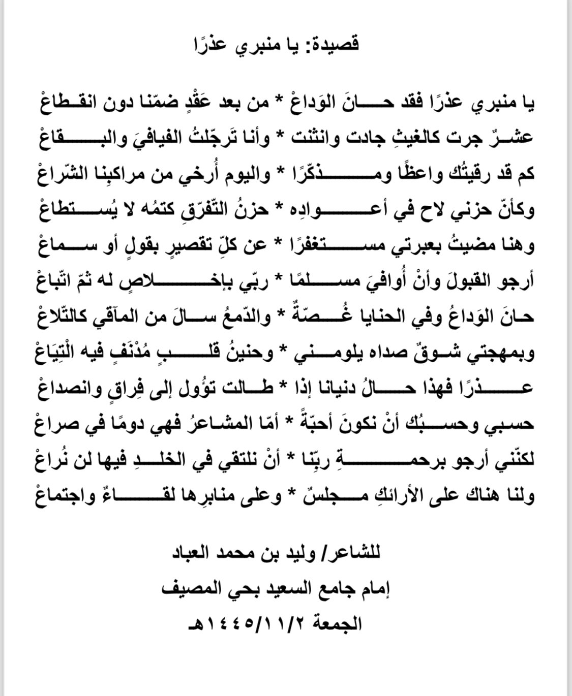 يا منبري عذرًا فقد حانَ الوَداعْ * من بعد عَقْدٍ ضمّنا دون انقطاعْ