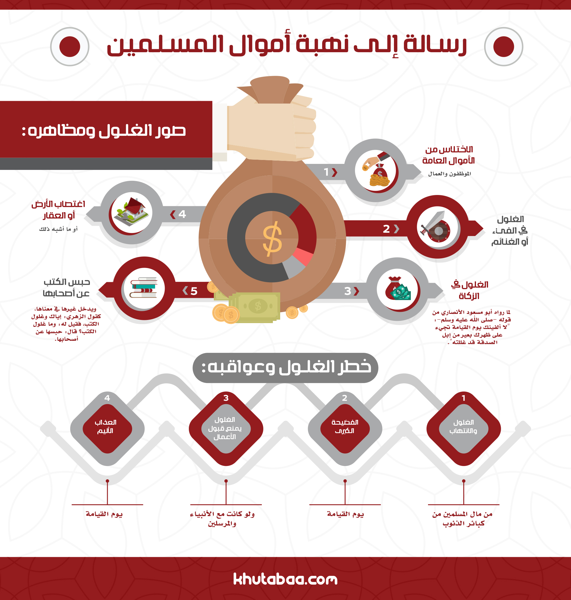 2- المال المغلول فضيحة كبرى يوم القيامة: وعن أبي هريرة -رضي الله عنه- قال: "قام فينا رسول الله -صلى الله عليه وسلم- ذات يوم فذكر الغلول فعظمه وعظم أمره، قال: "لا ألفين أحدكم يجيء يوم القيامة على رقبته بعير له رغاء يقول: يا رسول الله أغثني، فأقول لا أملك لك شيئا قد أبلغتك، لا ألفين أحدكم يجيء يوم القيامة على رقبته فرس له حمحمة فيقول: يا رسول الله أغثني، فأقول لا أملك لك شيئا قد أبلغتك. لا ألفين أحدكم يجيء يوم القيامة على رقبته شاة لها ثغاء يقول: يا رسول الله أغثني، فأقول لا أملك لك شيئا قد أبلغتك، لا ألفين أحدكم يجيء يوم القيامة على رقبته نفس لها صياح فيقول: يا رسول الله أغثني، فأقول لا أملك لك شيئا قد أبلغتك. لا ألفين أحدكم يجيء يوم القيامة على رقبته رقاع تخفق فيقول: يا رسول الله أغثني، فأقول لا أملك لك شيئا قد أبلغتك. لا ألفين أحدكم يجيء يوم القيامة على رقبته صامت فيقول: يا رسول الله أغثني، فأقول لا أملك لك شيئا قد أبلغتك".